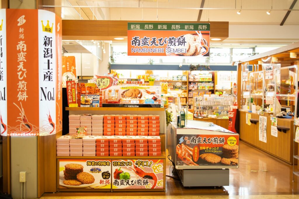 新潟や隣県・長野のお土産が購入できます。イチ押しは、日本海産甘えびのすり身をせんべい生地に練り込んだ「南蛮えびせんべい」。お土産コンテストの受賞歴もある、新潟の銘品です。そのほか、新潟・長野のご当地コラボお菓子なども充実。誰もが知る有名な銘菓・特産品から、珍しい地方限定商品まで多彩に揃います。